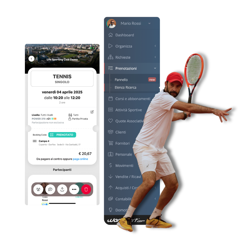 Una singola piattaforma per gestire tutte le necessità del tuo centro, dalla prenotazione dei campi, alle organizzazioni di corsi e tornei, al sistema di pagamento al controllo accessi fino alla domotica.