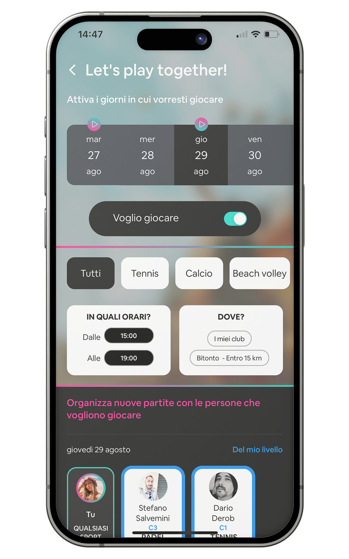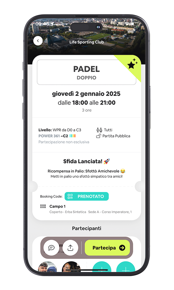 CONNETTITI E GIOCA Invitare e cercare altri giocatori del tuo stesso livello e con le tue stesse disponibilità non è mai stato così semplice. Il giocatore può impostare livello, sesso, età e fascia oraria della partita per facilitare la ricerca. DOWNLOAD THE APP TUTTO PER GLI ATLETI Organizza partite in un attimo: scegli lo sport e l’orario, trova altri giocatori e scendi in campo. Tutto in tempo reale, facile e veloce. SCARICA LA APP TRACCIA IL TUO LIVELLO Crea il tuo profilo, certifica il tuo livello con un maestro o autocertificalo. Gioca partite equilibrate con avversari del tuo stesso livello. SCARICA LA APP CAMPI E CENTRI VICINI A TE Scopri i campi sportivi nelle vicinanze, prenota in pochi click e scegli il pagamento che preferisci. Preparati a dare il massimo! SCARICA LA APP